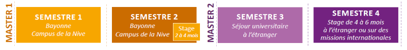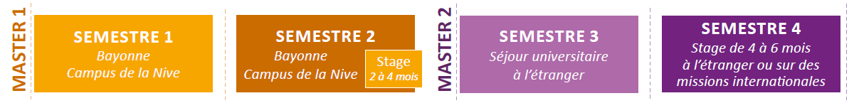 Au semestre 4, les étudiants effectuent un stage de 4 à 6 mois à l’étranger ou sur des missions internationales en France. Un mémoire de fin d’études est à rédiger et à soutenir en anglais.